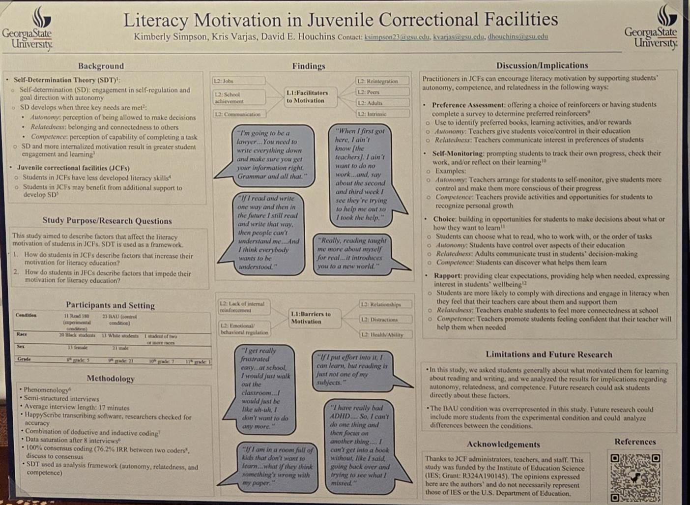 Students in juvenile correctional facilities (JCFs) display lower average reading and writing skills and often display behaviors in school that interfere with their education, so it is often assumed that they do not see value in education in general. However, it is important to center student voices and perspectives concerning education and motivation for reading and writing. To better understand the motivations and factors that affect motivations of students in JCFs, this qualitative study analyzes interviews with 34 students from three JCFs about their motivations for reading and writing and what facilitates or hinders their motivation. The resulting themes are analyzed using Self-Determination Theory (SDT) as a framework. The interview themes suggest understanding of the benefits of strong reading and writing skills, and they align with SDT in suggesting that students are motivated to learn and work in class when they have experiences that emphasize their autonomy, relatedness, and competence.